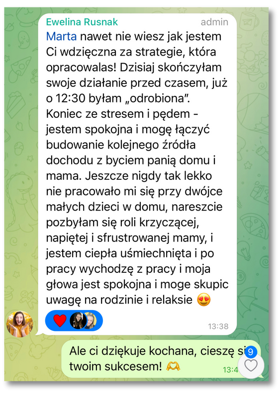 DODATKOWA opieka, wsparcie i mentoring poprzez chat grupowy PREMIUM z Martą oraz resztą grupy przez 2 miesiące